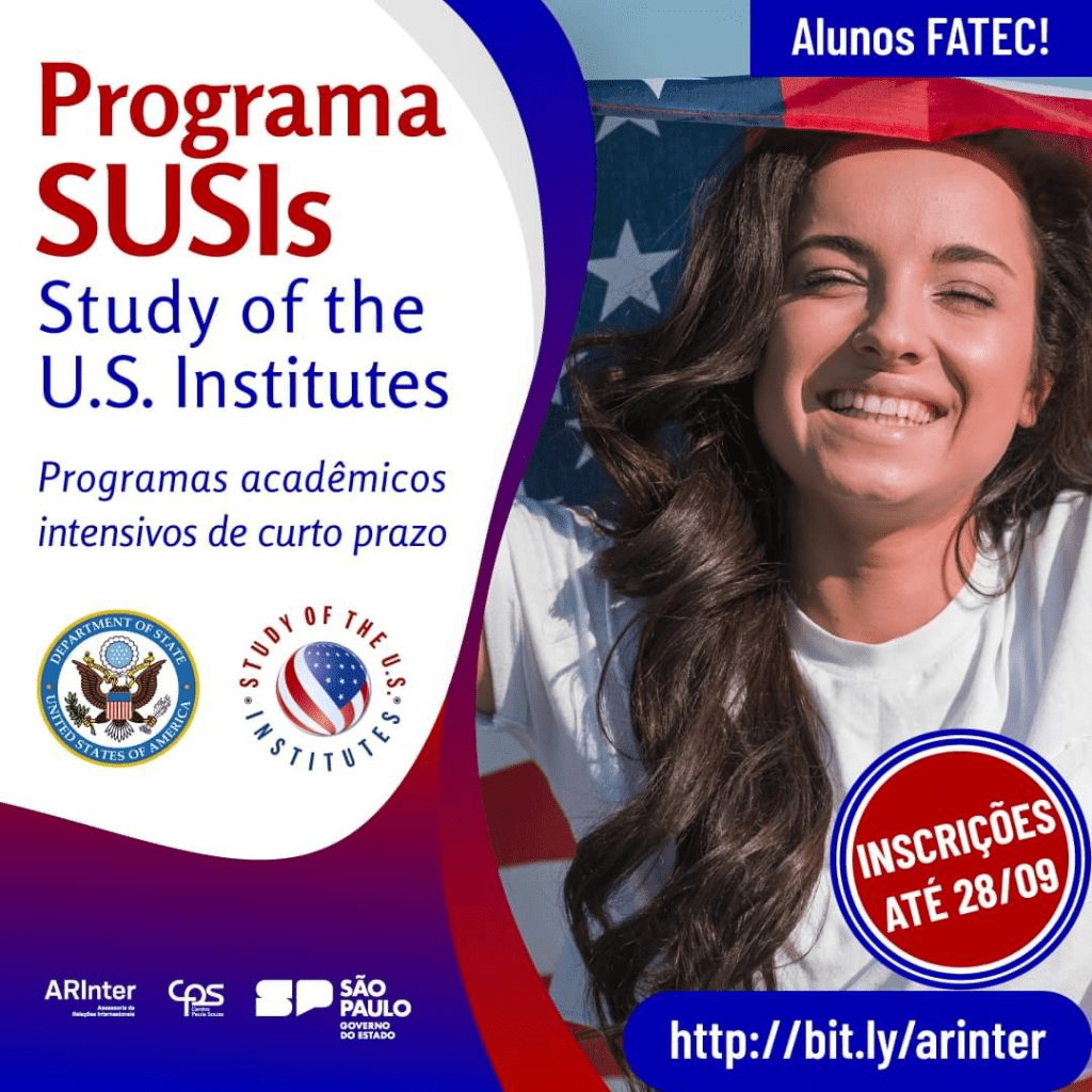 Serão indicados 6 estudantes das Faculdades de Tecnologia (Fatecs) para concorrer às vagas do programa Winter 2024 Study of the U.S. Institute for Global Student Leaders on Entrepreneurship and Economic Development (SUSI), realizado presencialmente pelo governo dos Estados Unidos, com possibilidade de adaptação para formato virtual, caso necessário. O programa está agendado para ocorrer entre janeiro e fevereiro de 2024.