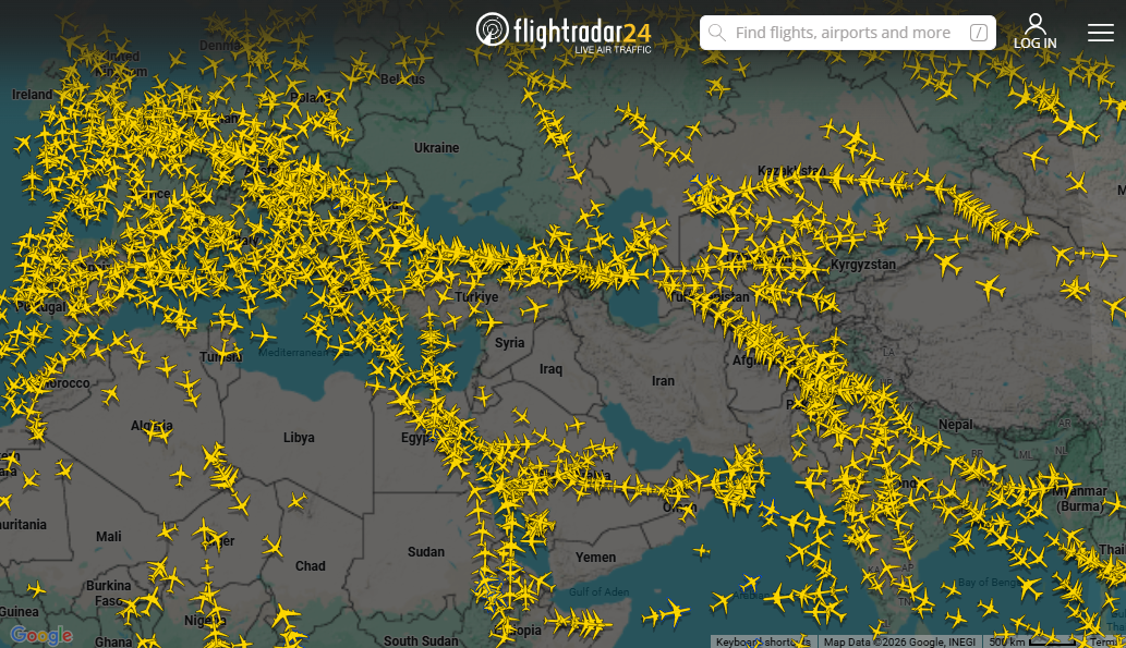 Trafego Aéreo sobre o Oriente médio – Dia 01 de março de 2026 às 19h37 (UTC – 3) Hora Brasil