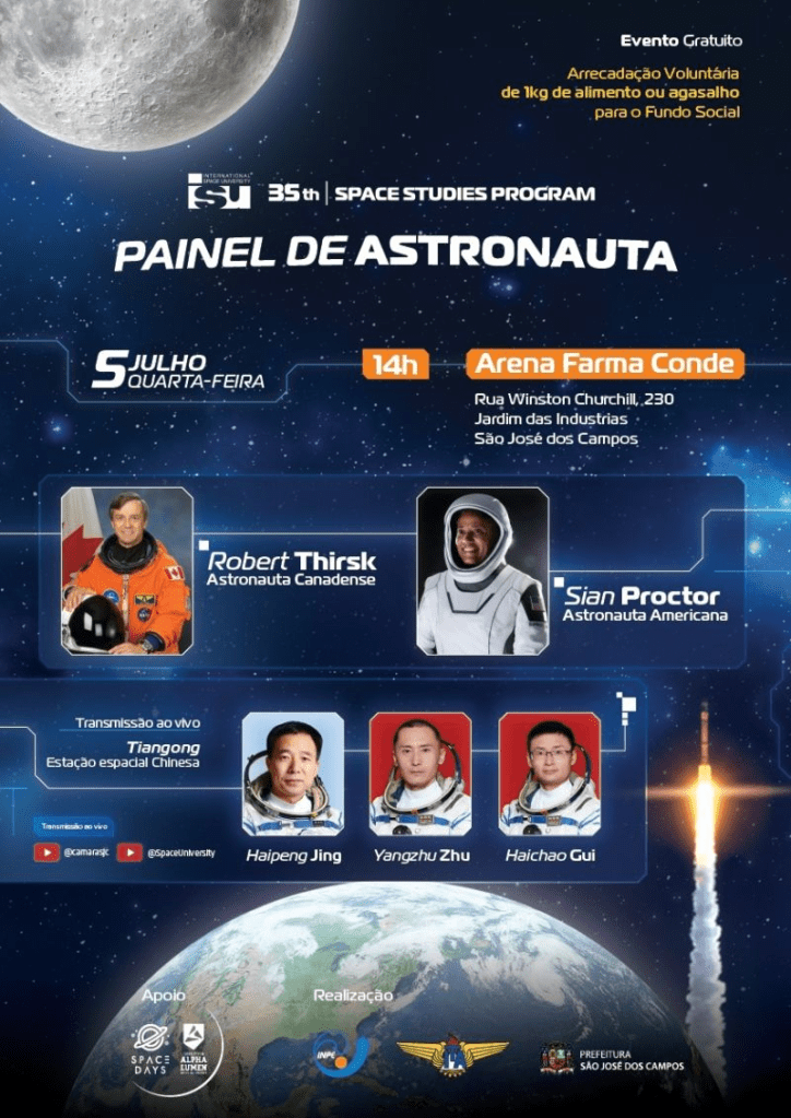 Continuando as atividades do SPACE STUDIES PROGRAM, teremos nesta quarta-feira (dia 5 de Julho) às 14 horas o evento Painel de Astronauta na Cidade de São José dos Campos. A entrada é gratuita e pedimos apenas a doação de 1 kg de alimento não perecível ou um agasalho. Não é necessário fazer inscrição.