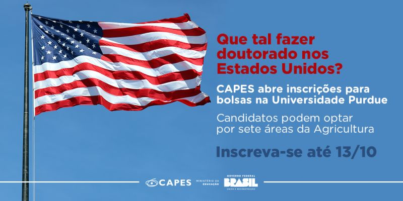 Estão abertas, até 13 de outubro, as inscrições para o Programa CAPES-Purdue de Doutorado Pleno em Agricultura. O edital 19/2023 selecionará até cinco bolsistas para a Universidade Purdue, nos Estados Unidos. As atividades se iniciam em agosto de 2024 e cada estudante receberá até US$ 50,3 mil anuais referente à bolsa que pode se estender por até cinco anos.