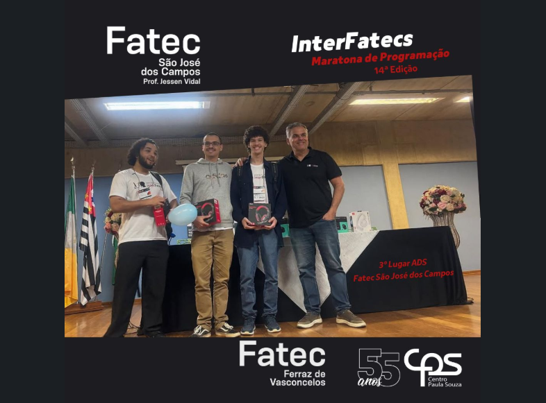 Parabéns à equipe Code Sapiens formada por Daniel Sendreti Broder, Gabriel Carvalho Silva, Gabriel Vasconcelos Ferreira (CST ADS) da Fatec de São José dos Campos, premiada com o terceiro lugar na 14ª da Maratona InterFatecs 2025.A final da competição de programação foi disputada no sábado (16) na Fatec Ferraz de Vasconcelos, na região do Alto Tietê.